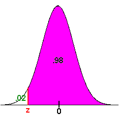 guarantee period on your tires? This problem asks us to go backwards. We want to find y such that P(x > y ) = 0.98. The picture shows that we need to subtract from 1, that is we want to first find the z-score such that this z-score corresponds to a probability of .02. The table gives us z = -2.05 Next we work backwards to find the raw score. We have