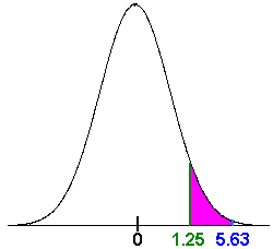 The probability that corresponds with 1.25 is .8944. Notice that 5.63 is off the chart. Thus, the probability that corresponds with 5.63 is 1. Since we want the "in between" area, we take 1 - .8944 = .1056 We can conclude that there is about an 11% chance that the mean number of visits for these 25 children will be between 48 and 55.