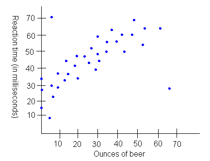Problem 6  Data was collected to study the effect of alcohol on reaction time.  Forty participants were given various amounts of alcohol and then took a test to see how many milliseconds it took to press a button upon seeing headlights.  The scatter diagram is shown below.