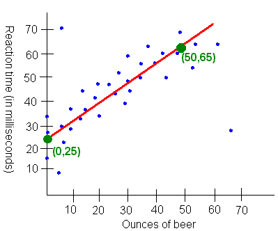 65 - 25 The equation is y = 25 + .8 x The y-intercept tells us that without drinking any alcohol, the reaction time is about 25 milliseconds. The slope tells us that for every ounce of alcohol a person drinks, reaction time goes up by about 0.8 milliseconds.