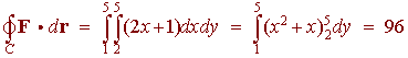 Problem 7 Find the work done by the force field F(x,y) = (3x2 - y) i + (x2 - y3) j as a particle moves counterclockwise around the rectangle with vertices (2,1), (5,1), (5,5), and (2,5). We use Green's Theorem. We have Nx - My = 2x + 1 We have