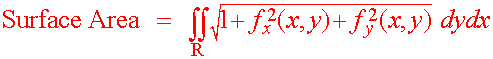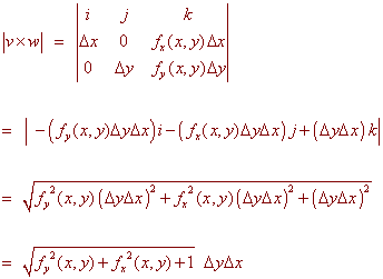 area of revolution. Now that we how Area = DyDx The area of the corresponding piece of the surface will not be DyDx since it is not a rectangle. Even if we cut finely, we will still not produce a rectangle, but rather will approximately produce a parallelogram. With a little geometry we can see that the two adjacent sides of the parallelogram are (in vector form) u = Dx i + fx(x,y)Dx k and v = fy(x,y)Dy i + Dy k We can see this by realizing that the partial derivatives are the slopes in each direction. If we run Dx in the i direction, then we will rise fx(x,y)Dx in the k direction so that rise/run = fx(x,y) Which agrees with the slope idea of the partial derivative. A similar argument will confirm the equation for the vector v. Now that we know the adjacent vectors we recall that the area of a parallelogram is the magnitude of the cross product of the two adjacent vectors. We have