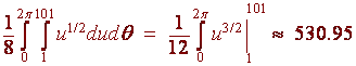 Solution We calculate partial derivatives fx(x,y) = -2x fy(x,y) = -2y so that 1 + fx2(x,y) + fy2(x,y) = 1 + 4x2 + 4y2 At this point if we listen closely, we should hear a little voice pleading "Polar Coordinates". We listen to its call and realize that the region is just the circle r = 5 Now convert the integrand to polar coordinates to get Now let u = 1 + 4r2 du = 8rdr and substitute