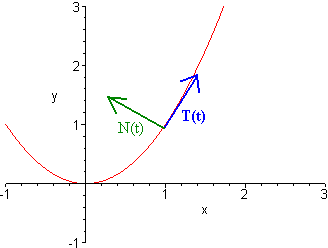 Example Find the unit normal vector for the vector valued function r(t) = ti + t2 j and sketch the curve, the unit tangent and unit normal vectors when t = 1.
