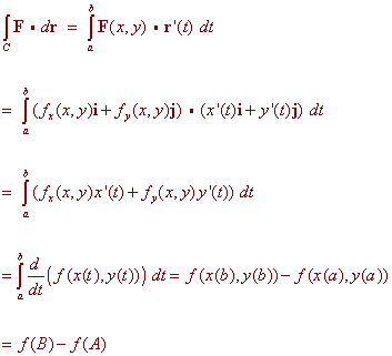 Proof of the Fundamental Theorem of Line Integrals To prove the fundamental theorem of line integrals we will use the following outcome of the chain rule: If r(t) = x(t)i + y(t)j is a vector valued function, then d/dt f(r(t)) = fx x'(t) + fy y'(t) We are now ready to prove the theorem. We have
