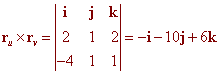 Solution We have ru(u,v) = (2u) i + j + v k rv(u,v) = (-2v) i + j + u k so that ru(1,2) = 2 i + j + 2 k rv(1,2) = -4 i + j + k r(1,2) = -3 i + 3 j + 2 k Now cross these vectors together to get