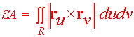 We now have the normal vector and a point (-3,3,2). We use the normal vector-point equation for a plane -1(x + 3) - 10(y - 3) + 6(z - 2) = 0 -x - 10y + 6z = -15 or x + 10y - 6z = 15 Surface Area To find the surface area of a parametrically defined surface, we proceed in a similar way as in the case as a surface defined by a function. Instead of projecting down to the region in the xy-plane, we project back to a region in the uv-plane. We cut the region into small rectangles which map approximately to small parallelograms with adjacent defining vectors ru and rv. The area of these parallelograms will equal the magnitude of the cross product of ru and rv. Finally add the areas up and take the limit as the rectangles get small. This will produce a double integral.