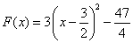 derive a rational function from a graph or information given. PREVIOUS SECTIONS: A. Linear Equations. (Section 2.2) Be able to write the equation for a linear word problem and solve it. (Exam 1) B. Functions. Chapter 2 Know how to find the difference quotient. (2.3) Understand the relationship between the difference quotient and the slope of a secant line. Be able to graph a step function or determine the function from its graph. (Section 2.4) Know how to find domain and range of a function. (Section 2.3) Operations of functions, Composite functions and their domain. (Section 2.6) Know Odd and Even function characteristics and use it to answer questions. (Section 2.4) D. Quadratic Functions (Section 3.1) Know how to find max and min for quadratic equations. 3. Put into standard form by completing the square. F(x) = 3x2 - 9x - 5 Be able to graph an equation given information. 4. f(x) is an EVEN function with a positive leading coefficient of degree 4. Two of its zeros are 4 and -2. The y-intercept is 64/7 and the function minimum is f(3) = -5. Graph the function. Find the function f(x). Textbook Review: 1. Read Chapter 3 Review on pages 264 – 266. 2. Do Chapter 3 Review Exercise on pages 267 – 269, # 29 – 106. Do SOME problems from each section. 3. Go over Review Guide for Exam 1 and 2 that cover sections above. Go over Quizzes that cover the problems in the above sections. Solutions: 1. a) D = (-