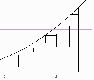 We can approximate the area by cutting out 6 rectangles. Since the base of the wall is 5 - 2 yards long, and there are 6 rectangles, the base of each rectangle is (5 - 2)/6 = .5 yards. The height of each rectangle is the y-coordinate of the left side of each rectangle. The x- coordinates are 2 + 0(.5),2 + 1(.5), 2 + 2(.5), 2 + 3(.5), 2 + 4(.5), 2 + 5(.5) so that the y coordinates are (2 + 0(.5))2,(2 + 1(.5))2, (2 + 2(.5))2, (2 + 3(.5))2, (2 + 4(.5))2, (2 + 5(.5))2 We see that the ith rectangle has y coordinate: height = (2 + i(.5))2 = 4 + 2i + .25i2 To get the area of the ith rectangle we multiply the height by the base: (4 + 2i + .25i2)(.5) Finally to get the total area we add the terms up: sum[(4 + 2i + .25i2)(.5)] This will be a lower bound for the area. Exercise: Find an upper bound for the area. III. Left and Right Sums If we take the limit as i approaches infinity, We arrive at the formulae: