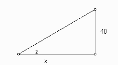 We have tan(z) = 40/x Taking derivatives we have that sec2(t)dz/dt = -40x-2 dx/dt sec(t) = sqrt(5)/3, x = 30 Plugging in we get: (5/9)dz/dt = -40/900 dz/dt = -(4/90)(9/5) = -2/25 = -.08 rad/min.