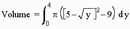 Example: Try revolving the curve y = x2 from 0 to 2 about the line x = 5 We have A = p[(5 - sqrt(y))2 - 9] so that
