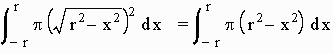 = p[r2x - x2/3]|from -r to r = p[(r3 - r3 /3) - (-r3 - -r3 /3) = 4/3 p r3 Exercise: Two cylinders of radius r intersect each other at right angles. Find the volume of their intersection. Hint: Consider cross sections parallel to both axes of rotation. These cross sections are squares. Then show that the side length is 2sqrt(r2 - x2) Click here for the cored sphere