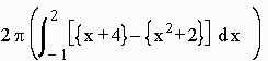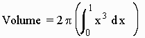 Example: Find the volume of revolution of the region bounded by the curves y = x2 + 2 and y = x + 4 about the y axis. Solution: We draw the picture with a cross section perpendicular to the x-axis. The radius of the cylinder is x and the height is the difference of the y coordinates: (x + 4) - (x2 + 2). We solve for a and b. (x + 4) = (x2 + 2). x2 - x - 2 = 0 . (x - 2)(x + 1) = 0. So that a = -1 and b = 2. Hence the volume is equal to