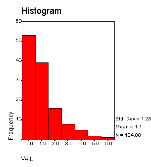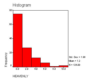 In looking at this data we can see that the mean amount of snow for Heavenly Valley is 1.1613 inches/per day with a standard deviation of 1.98116 is greater than Vail Mountain’s 1.0565 inches per day with a standard deviation of 1.28343. Based on the empirical rule 68% of the days received between zero inches and 3.14 inches of precipitation. 95 % of the days received between zero inches and 5.12 inches of precipitation. 99% of the days where precipitation levels were measured received between zero inches and 7.1 inches. In looking at the standard deviation for Vail Mountain one can see that one standard deviation to the left is going to be a negative number. This just means that one, two, and three standard deviations to the left are going to be zero. It shows that 68% of the days received between zero and 2.34 inches of precipitation, 95% of the days received between zero inches and 3.62 inches of precipitation and 99% of the days received between zero inches and 4.90 inches of precipitation. The 5% trimmed mean for Heavenly Valley is 0.8871 and the 5% trimmed mean for Vail Mountain is 0.9158. This shows that when you delete the bottom 5 % of the data and the top 5% of the data then Vail Mountain gets more precipitation on average than Heavenly Valley. The median for Heavenly Valley is 0.000 inches of precipitation and the median for Vail Mountain is 1.000. This shows that the central value in the ordered distribution for Heavenly Valley is 0.0000 and the central value of the ordered distribution for Vail Mountain is 1.000. The maximum amount in inches that Heavenly Valley received in any given day is 10 inches and the Vail Mountain is 6 inches. Both of the areas received at least one day of no precipitation. The interquartile range is both 2 inches for Heavenly Valley and Vail Mountain. This tells us that the spread of the data between the third and first quartiles is both relatively small, but the same. Below is a histogram of the amount of precipitation versus the number of days Heavenly Valley received each amount.