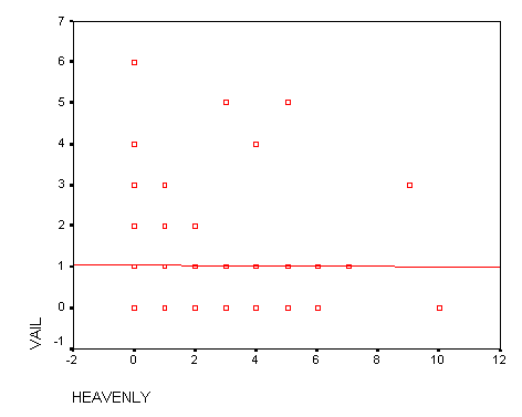Variable: VAIL The chart above gives us our a and b values for our least-squares line. The letter a is the y-intercept and the letter b is the slope of the line. The equation for our least squares line is: Y= -.004 + 1.062X This equation shows that for every additional inch of precipitation that Heavenly Valley gets Vail Mountain gets 1.062 inches more on the average. We can also interpret this equation to say that if Heavenly Valley gets no precipitation then the line predicts that Vail will get .004 inches. The Sig. Value is .940, which is really high, and thus this line is a useless indicator because a typical p value is .05.