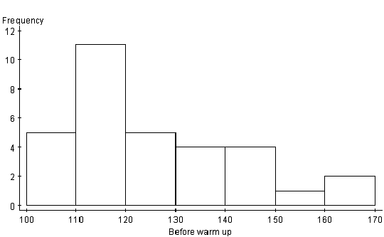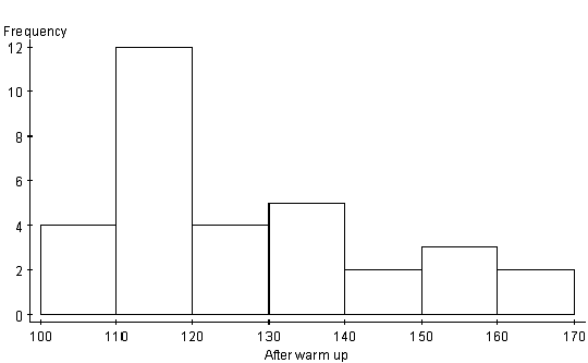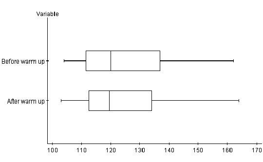 Both sets are skewed to the right and are unimodal. The stem and leaf display helps to visualize the data spread. There are three gaps in the after warm up display and only one gap in the before warm up display. The 110 to 130 degree categories contain the most number of data. The before warm up stem and leaf appears to be more consistent. The data in this display appears to be quite similar. Again, by observing this display, it is difficult to find any major differences. The histograms below give another perspective for the data distribution. Both histograms are unimodal. This means that most students fell into the 110 to 120 degree category. Both histograms are also skewed to the right. As the degrees on the stretching machine got higher, the number of students in this category decreased. It is hard to make any conclusion from these graphs, but it appears that the after warm up has a slightly higher top end.