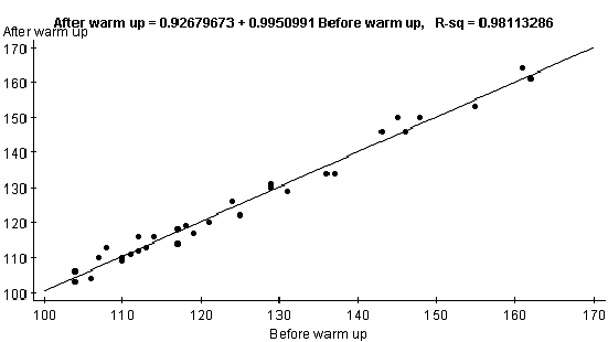 My project takes place in a martial arts studio in Incline Village, Nevada. I wanted to know if a ten-minute warm up is in fact related to an increase in stretch. A warm up obviously reduces the risk of injury, but does it actually increase the range of stretch. Many students have noticed their greatest results without a warm up. They claim it is because their muscles are still fresh and unused which enables them to attain maximum flexibility. I took a convenience sample of thirty-two Taekwon-do students of various experience levels. I put each student on a stretching machine to record the maximum stretch (in degrees). This was done at the time each student walked in the door and after a rigorous ten-minute warm up. The warm up consisted of each student breaking a sweat and a lot of motion drills with the legs. The null hypothesis is that there is no difference between a cold stretch and a warm stretch. The alternate hypothesis is that the stretch after the warm up is greater than the stretch before the warm up. My secondary null hypothesis is that there is no correlation before warm up stretching and after warm up stretching. The alternate hypothesis is that there is a relationship with before warm up stretching and after warm up stretching. I labeled the before warm up stretch in the X- axis and the after warm up stretch in the Y- axis for the correlation and regression charts. The following chart summarizes the statistics of my project. The sample means in the before and after cases are very close to one another. This interpretation shows that there was not a large difference between each student’s stretch. When comparing the minimum and maximum results, it is apparent that the warm up had the highest stretch. The standard deviation in both cases explains why the data is so spread out. The medians are also similar. By looking at this chart it is hard to make any conclusions since the data are very similar.