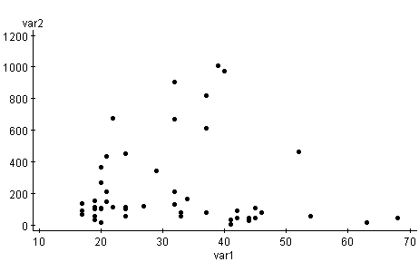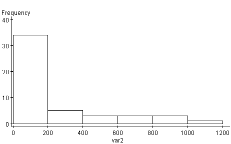 The following graph is called a Stem and Leaf graph. This graph shows the data by taking the first digit (depending on the data) and stacking them to for the stem. The second digit (also depending on the data) is lined up to create the leaf. While there can be multiples of the same numbers in the leaves, the stem numbers are only represented by one number. For example if there was two 19s in the data set, both 9s would be placed in the leaf but only one 1 would be shown on the stem as seenbelow. Variable 1 is the ages while Variable 2 is the amount spent. Looking at these graphs it is easy to see why they are called Stem and Leaf plots. Variable: var1 1 : 77799999 2 : 00000111224444479 3 : 22223347779 4 : 0112244556 5 : 24 6 : 38 Variable: var2 0 : 01133344555555788899000011112334 1 : 56 2 : 116 3 : 46 4 : 356 High: 612.62, 671.56, 672.37, 820.63, 907.13, 970.54, 1009.03